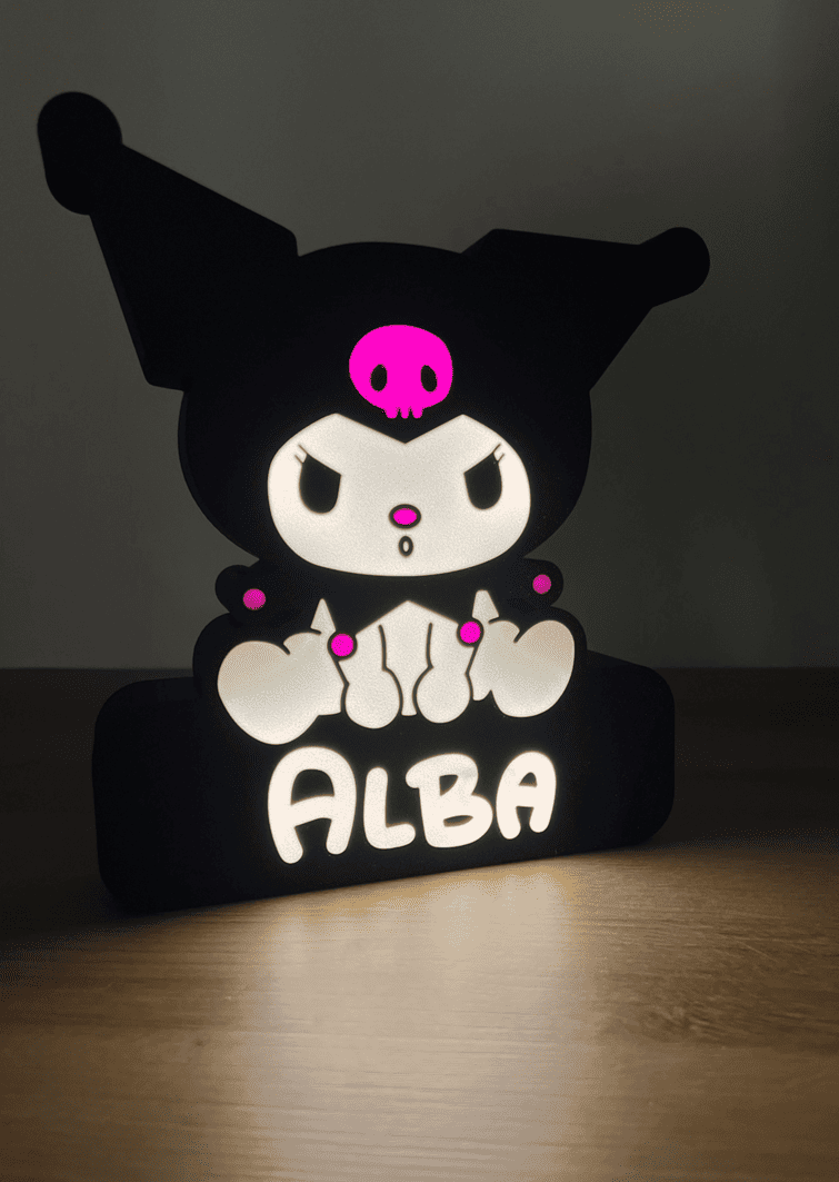 Lámpara personalizada inspirada en el estilo Kuromi, impresa en 3D y con iluminación LED de 12V. Diseñada para colocar sobre mesa o colgar en pared, es ideal para habitaciones infantiles y juveniles, combinando ternura y carácter en una pieza única.